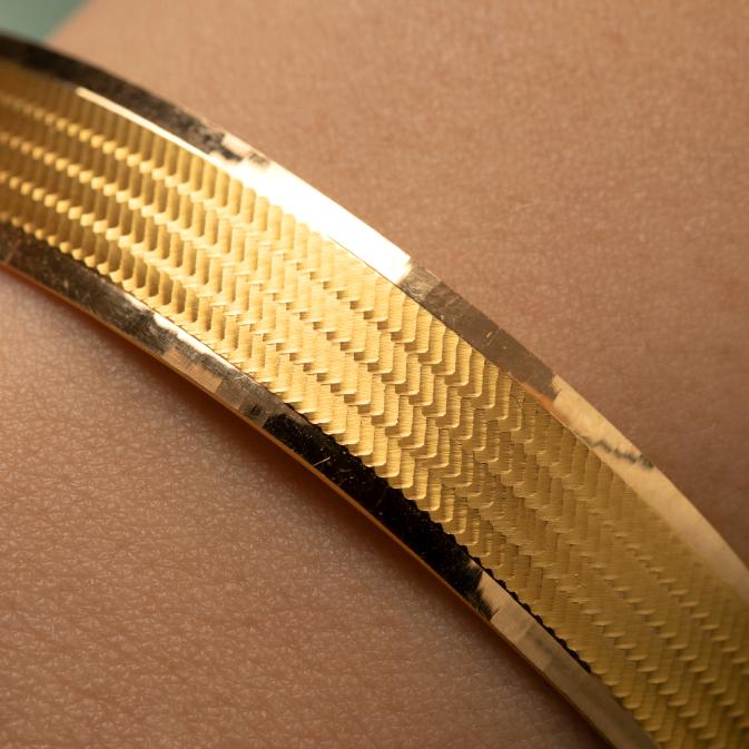 22 ayar saf altından üretilmiş olan bu bilezik, 10 gramlık ağırlığı ve 10mm genişliği ile hem hafif hem de gösterişli bir kullanım sunar. İnce işçilikle işlenen Trabzon desenleri, bilek üzerinde ışıkla adeta dans eder. Günlük kullanımda da özel günlerde de zarif bir tamamlayıcı olarak öne çıkar.