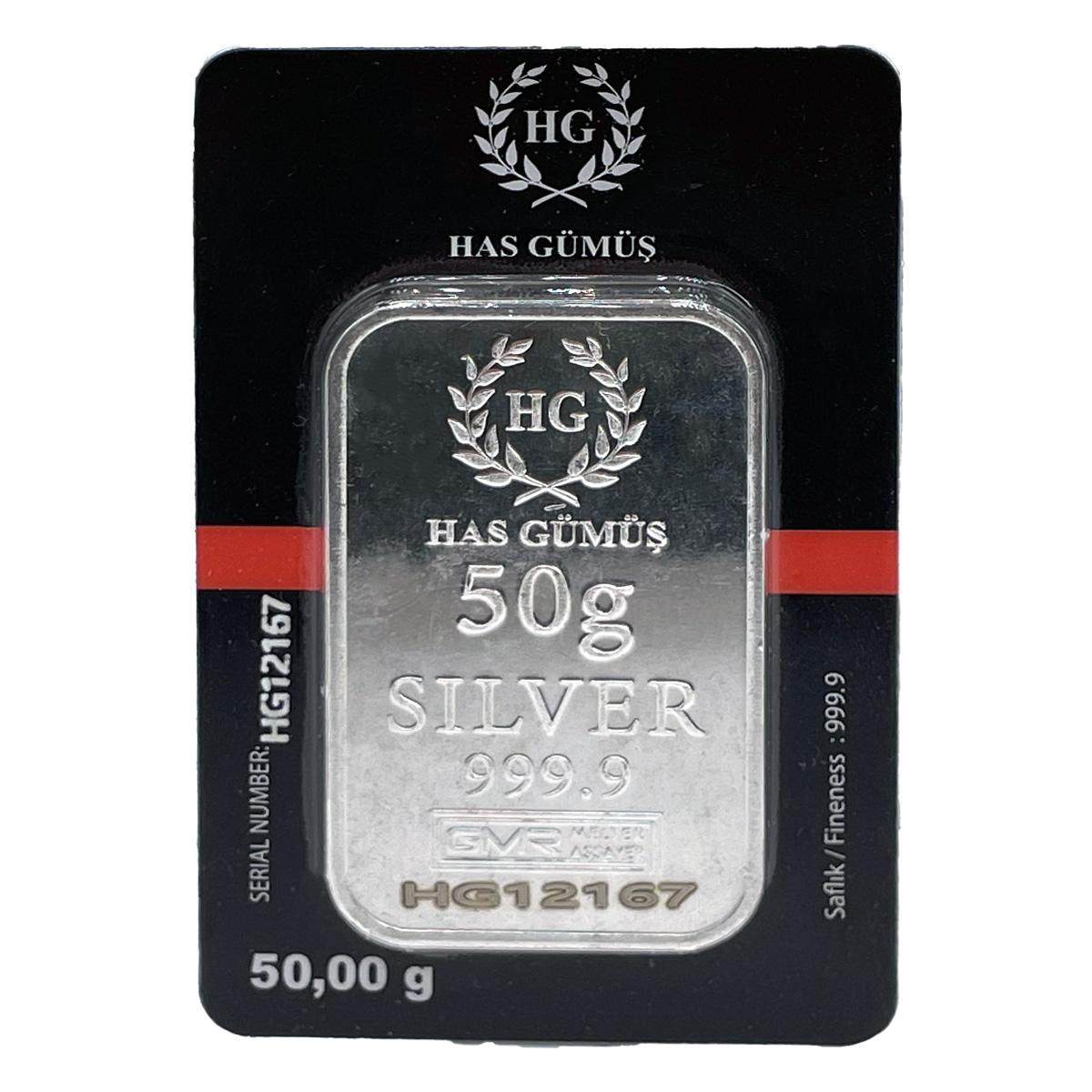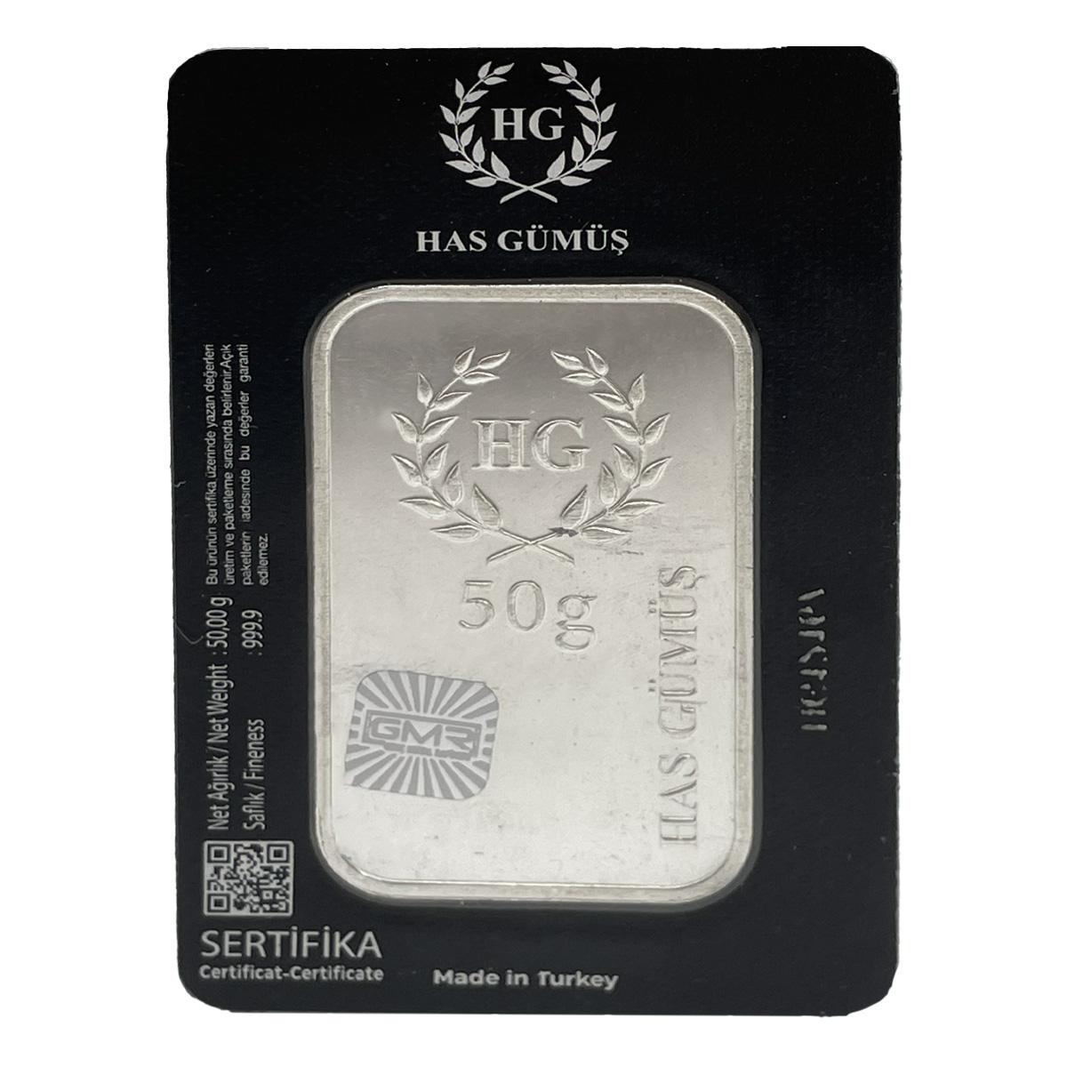 Her bir külçe, Has Gümüş güvencesiyle modern teknolojiler kullanılarak üretilir ve kalite sertifikası ile birlikte gelir. Ön yüzünde 50 Gr, 999 Ayar ve Has Gümüş logosu yer alırken, arka yüz pürüzsüz bir yüzeye sahiptir.