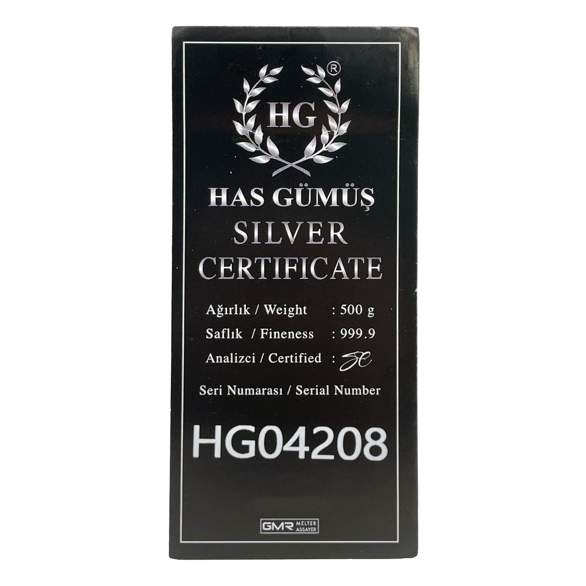 Has Gümüş markasının sunduğu kalite ve güvence, her ürününde olduğu gibi bu 500 gramlık külçede de en üst düzeydedir. Üzerinde 500 GR, 999 Ayar ibaresi ve marka logosu yer alan külçe, pürüzsüz yüzeyiyle hem estetik hem de prestijli bir görünüme sahiptir.