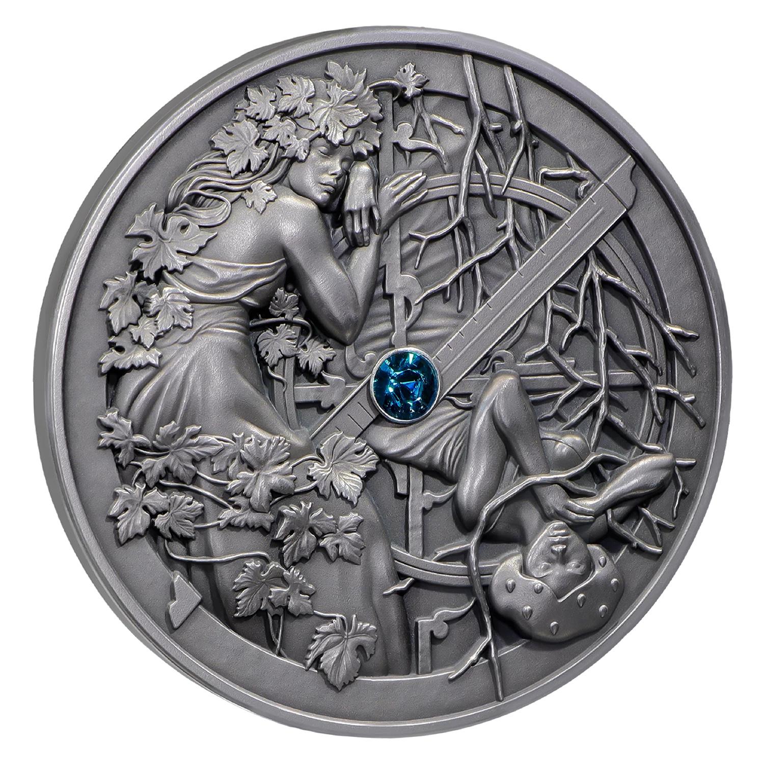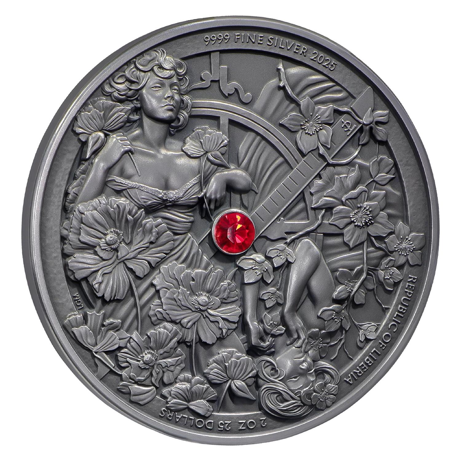 Bu gümüş sikkenin arka yüzünde Sonbahar ve Kış mevsimleri yer alır. Sonbahar neredeyse uykudadır; soğuk kış aylarıyla başa çıkmak için uyuyan doğanın metaforudur. Çıplak dallara yaslanmış uyuyan bir kadın olarak tasvir edilen Kış, hayatın içsel soğukluğunu ve sertliğini yansıtır. Arka yüzünde de soğuk tonlarda bir taş parçası bulunur. Bu gümüş sikkenin ön yüzünde İlkbahar ve Yaz mevsimleri yer alır. Olasılıklara açıklığı ve beklentileri temsil eden İlkbahar, uzun kış mevsiminden kiraz çiçekleriyle çevrili bir şekilde uyanan bir kadın olarak tasvir edilir. Yaz ise gelincik çiçekleriyle çevrili gururlu bir kadın olarak tasvir edilir. Ön yüzde yine sıcak tonlarda bir taş parçası ve şu yazılar yer alır: "LİBERYA CUMHURİYETİ" - basıldığı ülke, "25 DOLAR" - nominal değer, "2 OZ" - sikkenin ağırlığı ve "9999 SAF GÜMÜŞ" - gümüşün saflığı.