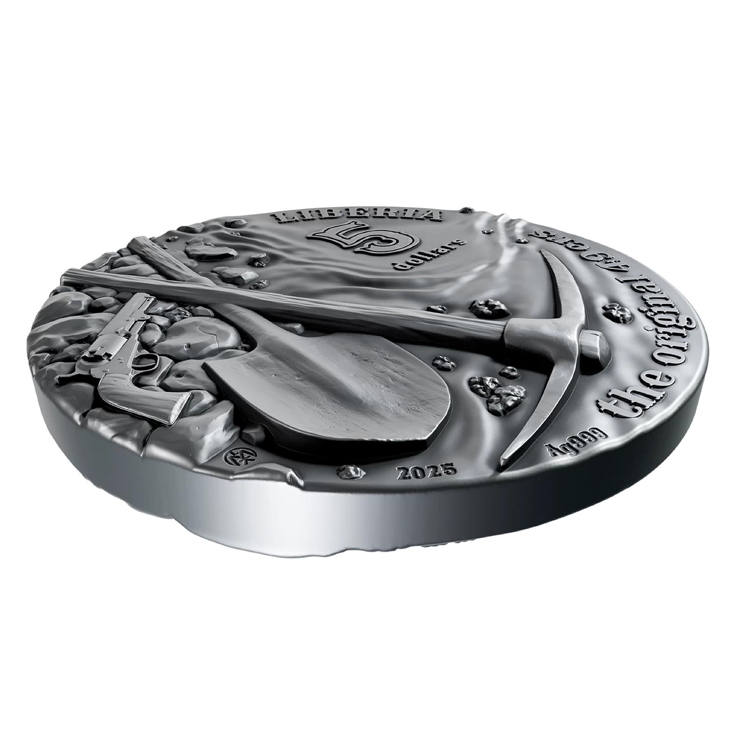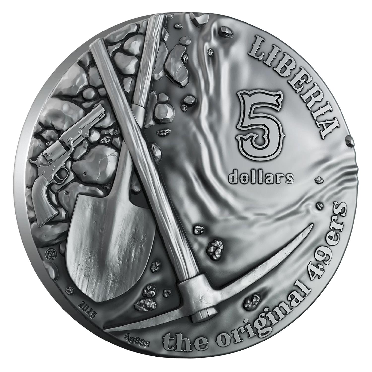 Bu Gümüş sikkenin arka yüzünde, nehrin kenarında altın arayan sakallı bir altın arayıcısı yer alıyor. Nehirden çıkardığı gerçek bir altın külçesi olan parıldayan bir altın külçesini tutarken yüzü zaferle aydınlanıyor. Arkadaki birkaç kişi, diğer altın arayıcısının başarısını ya alkışlıyor ya da üzülüyor. Engebeli dağlar ve el değmemiş vahşi doğa, dönemin yalın güzelliğini ve zorluklarını yansıtıyor. Arka yüzünde ayrıca "KALİFORNİYA ALTIN AKINI" - sikkenin adı - yazısı da yer alıyor. Bu sikkenin ön yüzünde, her altın arayıcısının kullandığı aletler yer alıyor: kayalık bir nehir yatağında çaprazlanmış bir kazma ve kürek. Engebeli arazide duran bir silah, bize altın akınlarının kanunsuz doğasını hatırlatıyor. Ön yüzünde ayrıca şu yazılar yer alıyor: "LİBERYA" - paranın basıldığı ülke, "5 DOLAR" - nominal değer, "2 OZ" - paranın ağırlığı, "Ag 999" - gümüşün saflığı ve "orijinal 49'lular" - Kaliforniya vahşi doğasında servet arayan korkusuz öncüleri anıyor.