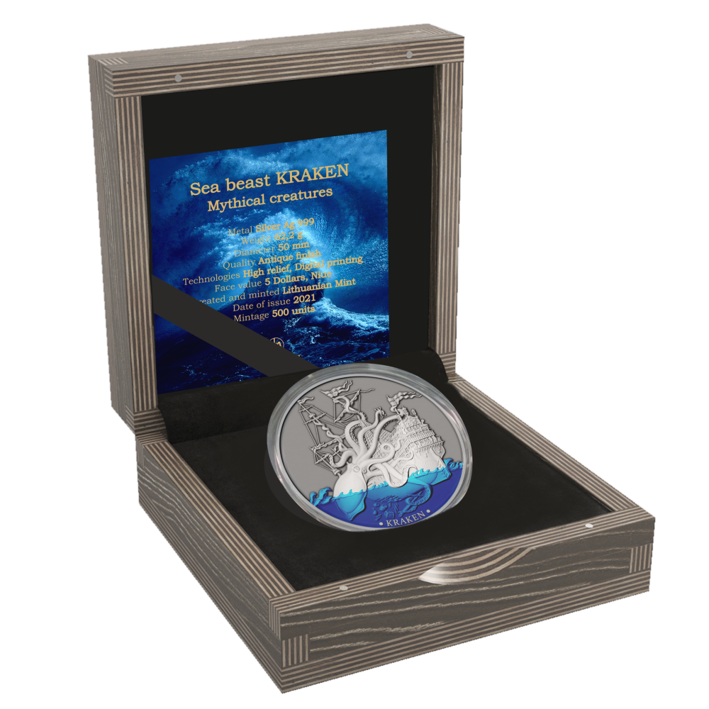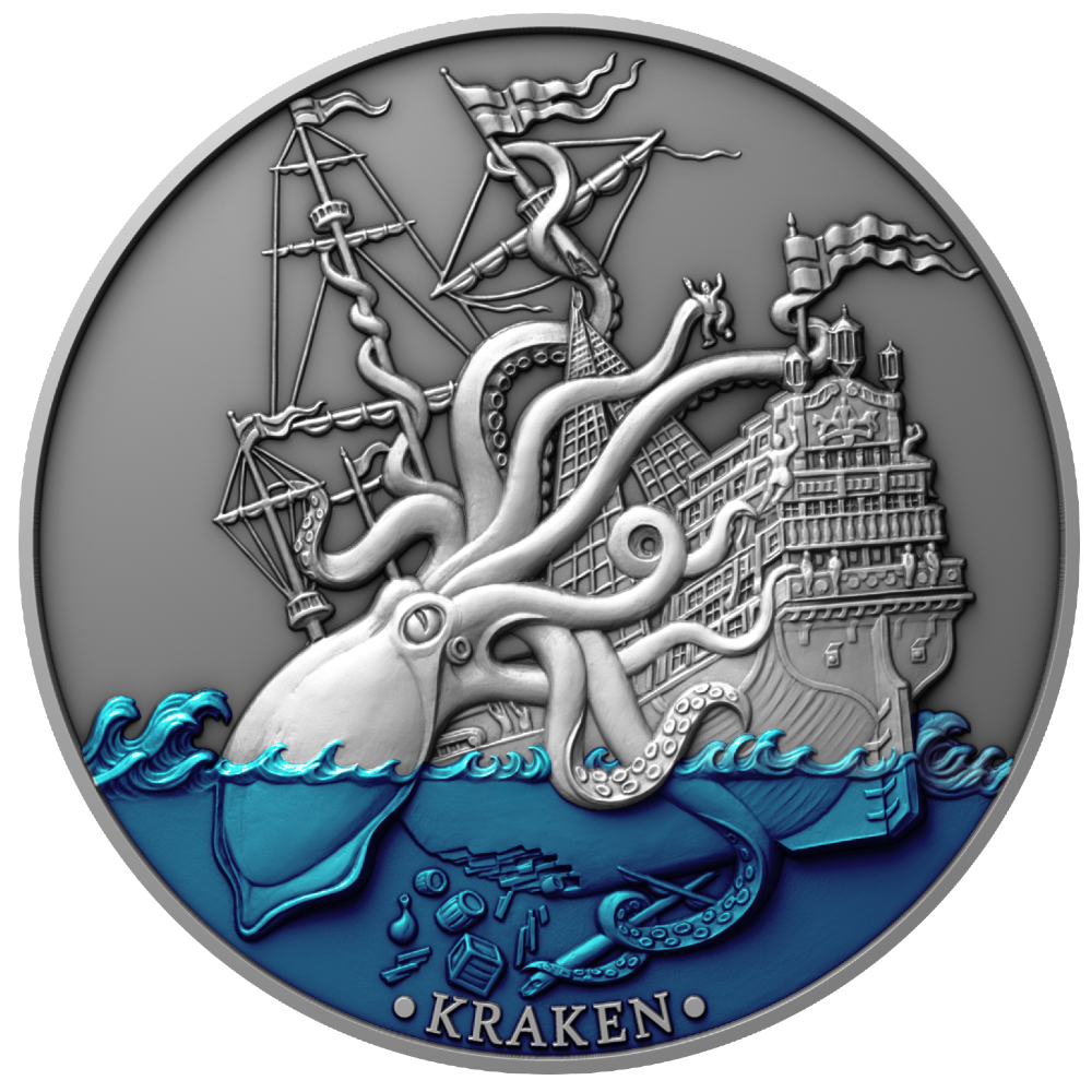 Madeni paranın arka yüzünde bir Kraken'in bir gemiyi parçalaması tasvir edilmiştir. Kraken, gemilere saldırdığı ve denizcileri öldürdüğü bilinen devasa boyutlarda efsanevi bir deniz canavarıdır. Görsel, titiz detaylar ve suyun renkleriyle zenginleştirilmiştir. Alt kısımda "KRAKEN" yazısı - madeni paranın adı. Madeni paranın ön yüzünde, her biri serideki dört madeni paradan birini temsil eden dört bölüm bulunur. Ortada, Niue Kamu Mührü. Çevrede ise "EFSANEVİ YARATIKLAR" - koleksiyonun adı, "2021" - basım yılı, "5 DOLAR" - nominal değer ve "Ag 999" - gümüşün saflık derecesi yazıları bulunur.
