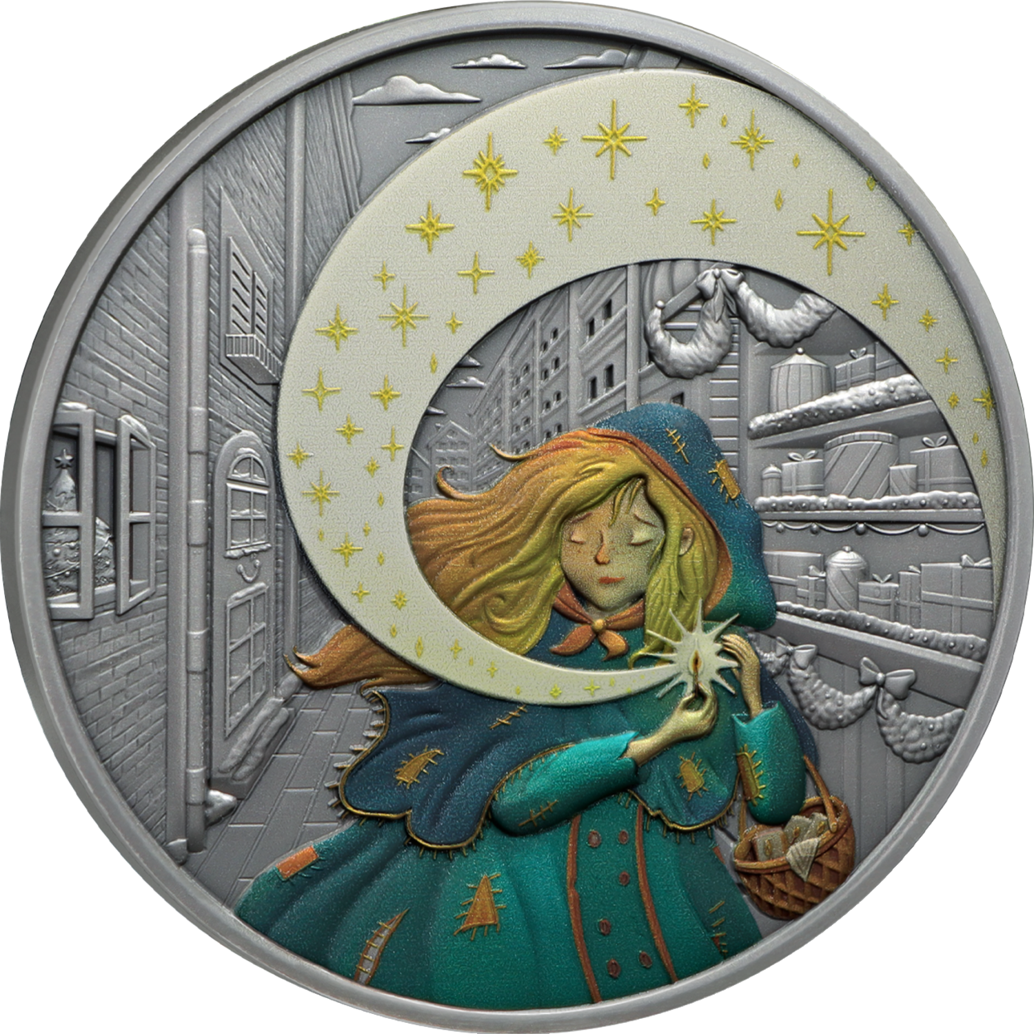 Bu madeni paranın arka yüzünde, elinde bir kibrit tutan Küçük Kibritçi Kız tasvir edilmiştir; kibritin ışıltılı ışığı, çocuğun ait olduğu yeri, Cennet'in lütfunu hatırlatır. Madeni paranın ön yüzünde, bir kibritin alevine sarılı Niue Kamu Mührü ve şu yazılar yer alır: "BİR DOLAR" - nominal değer, "2024" - basım yılı ve "Ag 99" - gümüşün saflığı.